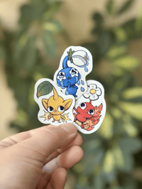 A set of three Pikmins each showing off the element that they are immune to. In this set you get 3 die-cut 1.5in stickers. Glossy sticker paper.